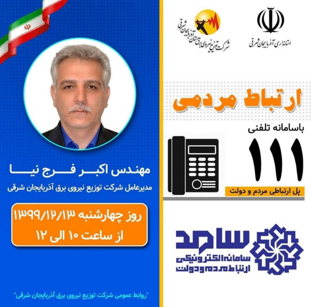 به گزارش آدینه پرس به نقل از روابط عمومی شرکت توزیع نیروی برق استان؛ شهروندان بزرگوار در سرتا سر استان، براساس هماهنگیهای به عمل آمده، آقای مهندس اکبر فرجنیا مدیر عامل شرکت توزیع نیروی برق استان آذربایجانشرقی از ساعت ۱۰ الی ۱۲ روز چهارشنبه ۱۳/ ۱۲ / ۹۹ با حضور در محل دفتر بازرسی، مدیریت عملکرد و امور حقوقی استانداری آذربایجانشرقی،...