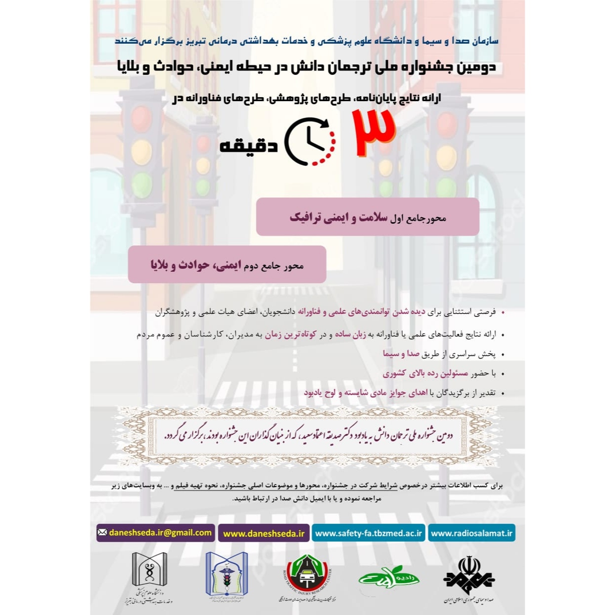 به گزارش پایگاه خبری آدینه پرس به نقل از روابط عمومی دانشگاه علوم پزشکی تبریز، در راستای ارتقای دانش سلامت و ایمنی به ویژه در حیطه ترافیک و ترجمان دانش برای گروه های هدف شامل مدیران، کارشناسان و عموم مردم، جشنواره سالانه کشوری ترجمان دانش ایمنی، حوادث و بلایا برگزار میشود. جشنواره ترجمان دانش فرصتی برای ارائه نتایج طرحهای مختلف...