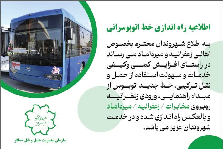 به گزارش آدینه پرس، محمد حسین زاده با اعلام این خبر گفت: در راستای افزایش کمی وکیفی خدمات و سهولت استفاده از حمل و نقل ترکیبی، خط جدید اتوبوس از مبدآ راهنمایی، ورودی زعفرانیه روبروی مخابرات- به سمت زعفرانیه-میرداماد و بالعکس راه اندازی و در خدمت شهروندان عزیز است. وی افزود: شهروندان محترم و اهالی عزیز زعفرانیه و میرداماد...