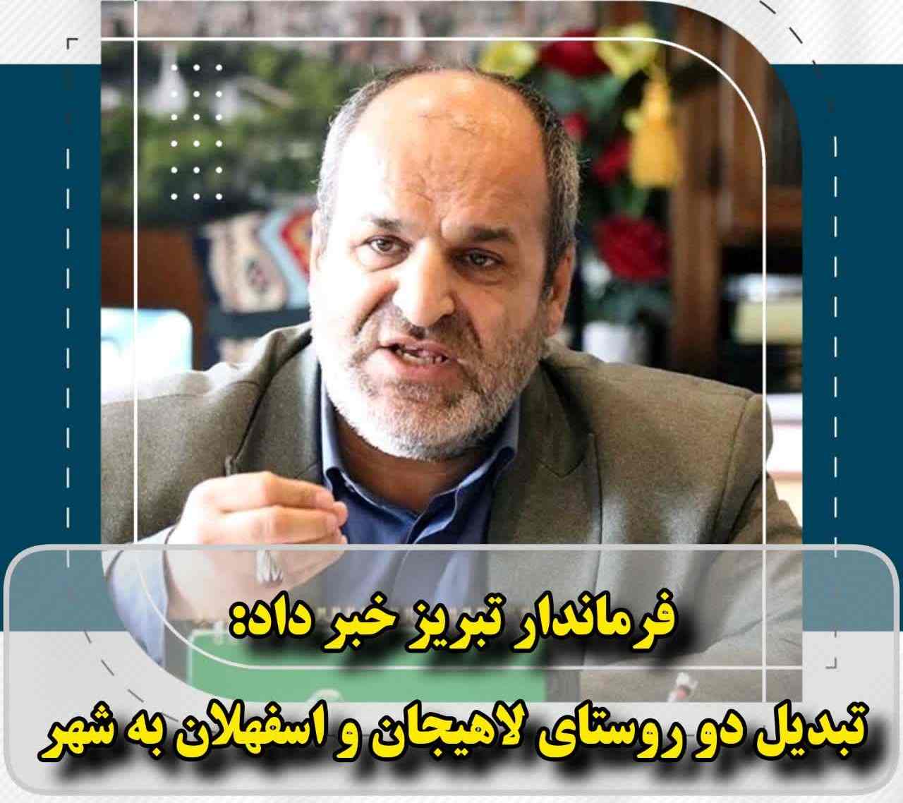 فرماندار شهرستان تبریز خبر داد: تبدیل دو روستای لاهیجان و اسفهلان به شهر