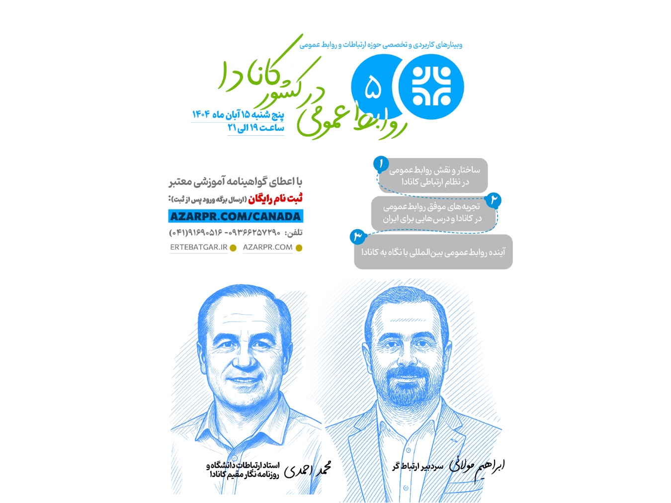 آدینه پرس ، پنجمین نشست از سلسله وبینارهای کاربردی و تخصصی حوزه ارتباطات و روابطعمومی با عنوان «روابطعمومی در کشور کانادا» روز پنجشنبه ۱۵ آبان ۱۴۰۴ از ساعت ۱۹ تا ۲۱ برگزار میشود. به گزارش آدینه پرس ، ابراهیم مولائی، دبیر علمی و میزبان وبینارهای تخصصی رسانه ارتباطگر، با اعلام این خبر گفت: «وبینار “روابطعمومی در کشور کانادا” از...